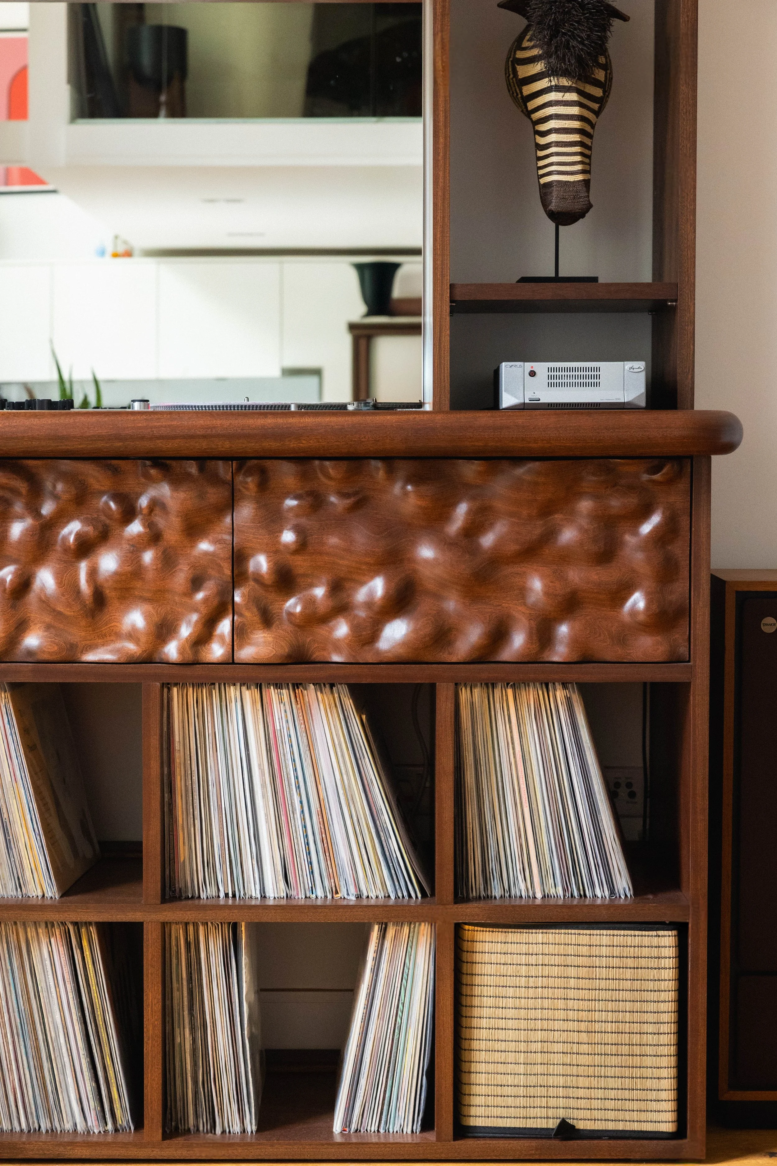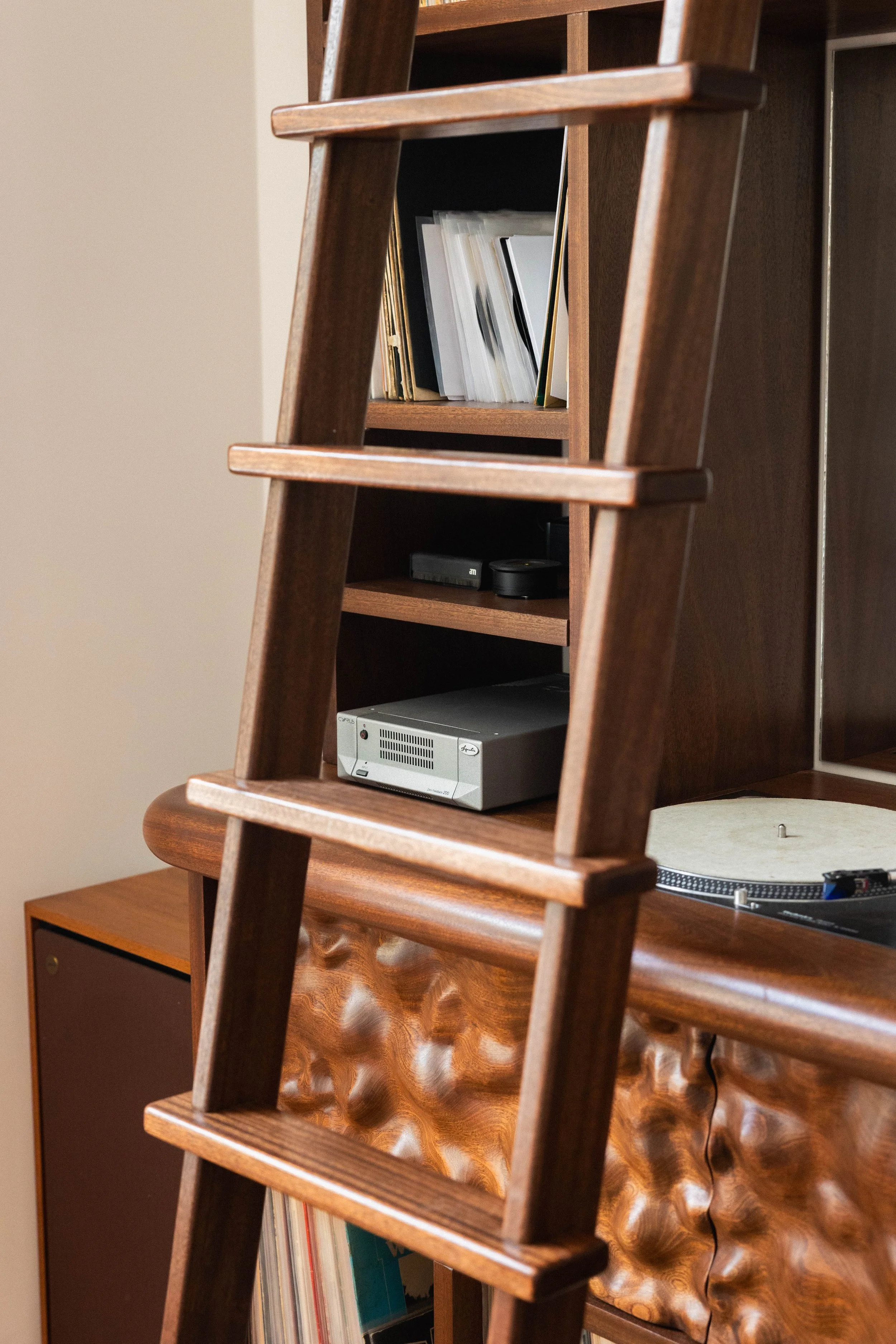 A bespoke DJ Booth for a home in the Old Town Hall apartments in Bermondsey, South London. Constructed from Sapele, the booth consists of a solid 65mm Booth top, the Don Heston trade mark texture fronts 3 45” record drawers and hidden LED lighting throughout—piece complete with a bespoke Sapele ladder to reach the 3.5m summit.